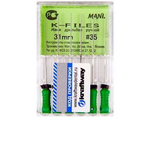 Приобрести К-файлы № 35 Mani в коробке на 6 штук по цене от производителя можно в нашем интернет-магазине. Дополнительную консультацию можно получить у нашего менеджера, он же поможет оформить заказ, товар доставляется транспортной компанией или курьером.